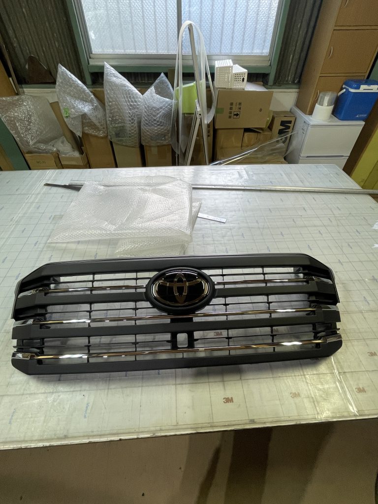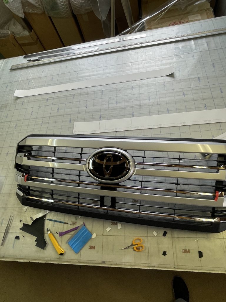 愛知県豊田市のK様。ランクル300のフロントグリルにグロスブラックでラッピングをご希望です。グリルのシルバー部分、4本とトヨタマークの回りの楕円をブラックアウトです。外して持って行きますねと。