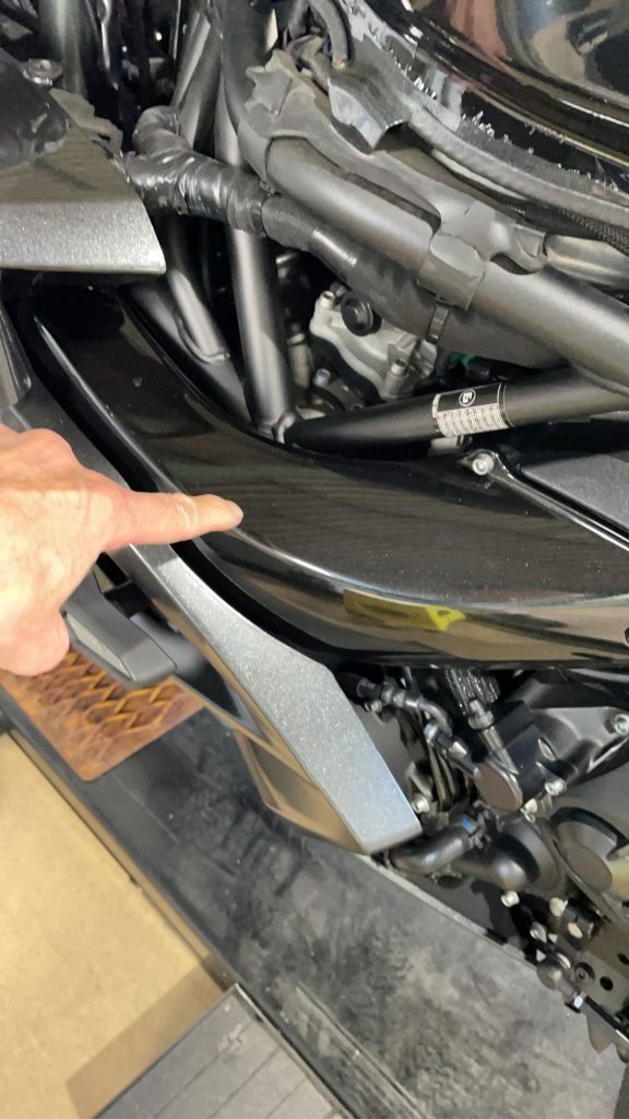 エアインテークダクトもダークグレーメタリックでした、(ソリッドブラックに見えてた)ここもグロスブラックで。サイドカウルは外せませんでした。一つのパーツが外れなかったため!
