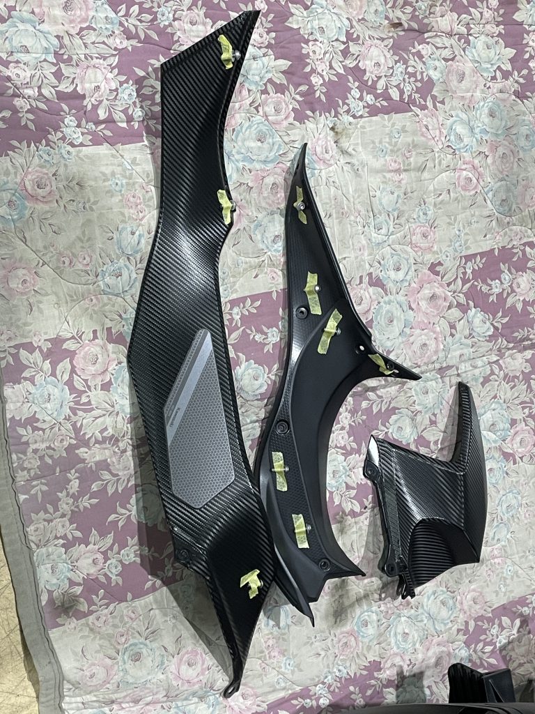 後ろからつながるパネル、片側4つのパーツ外します。タンク下のパネルに付いているニーグリップはくり抜きます。こことタンク前方のZ形のパーツはブラックカーボンです。ここでカーボンの柄の方向がそれぞれずれてしまわないように注意!水平に対して45度に右上から左下に。