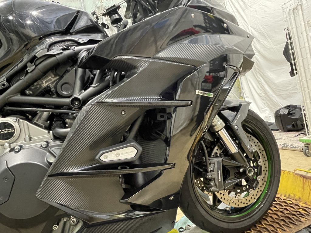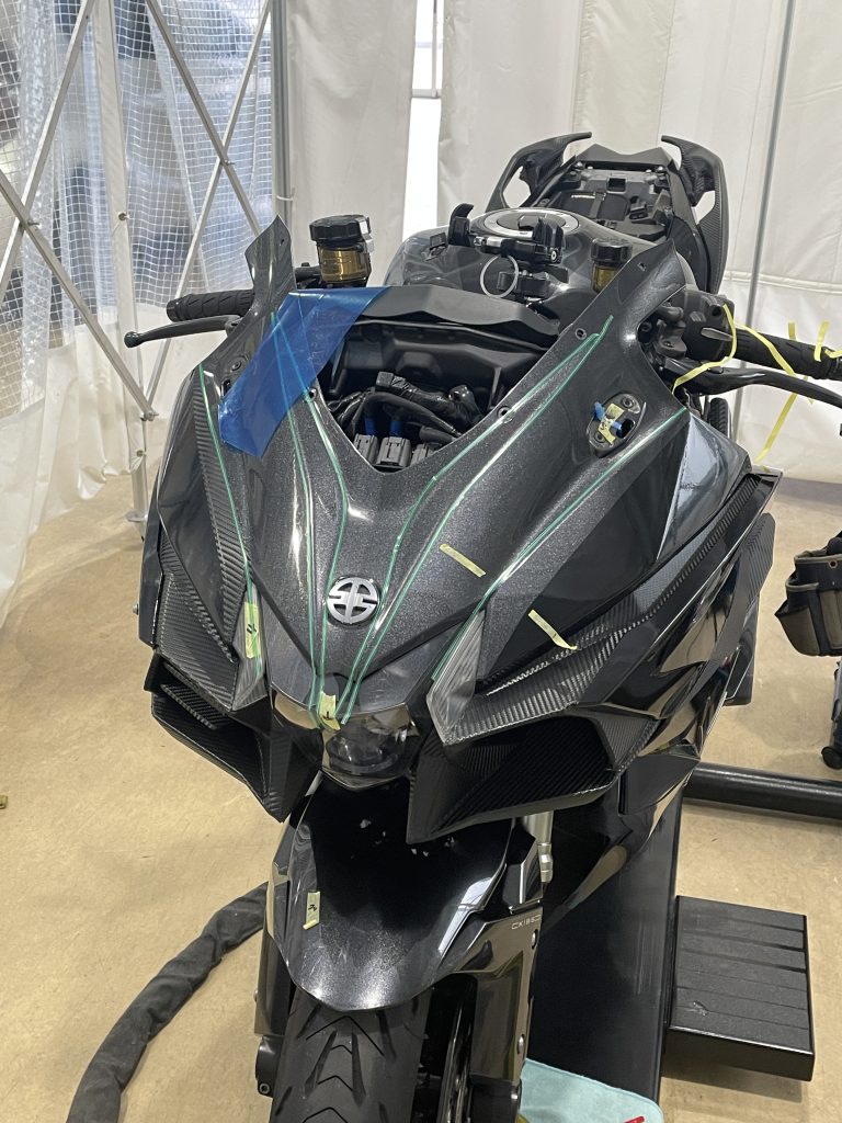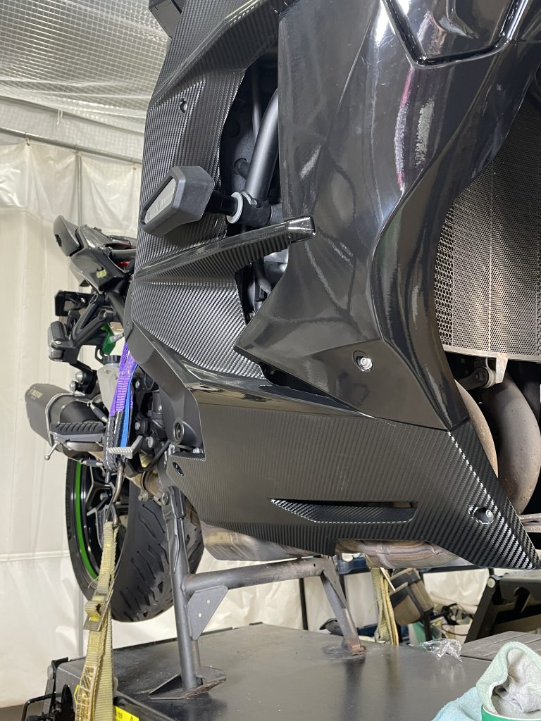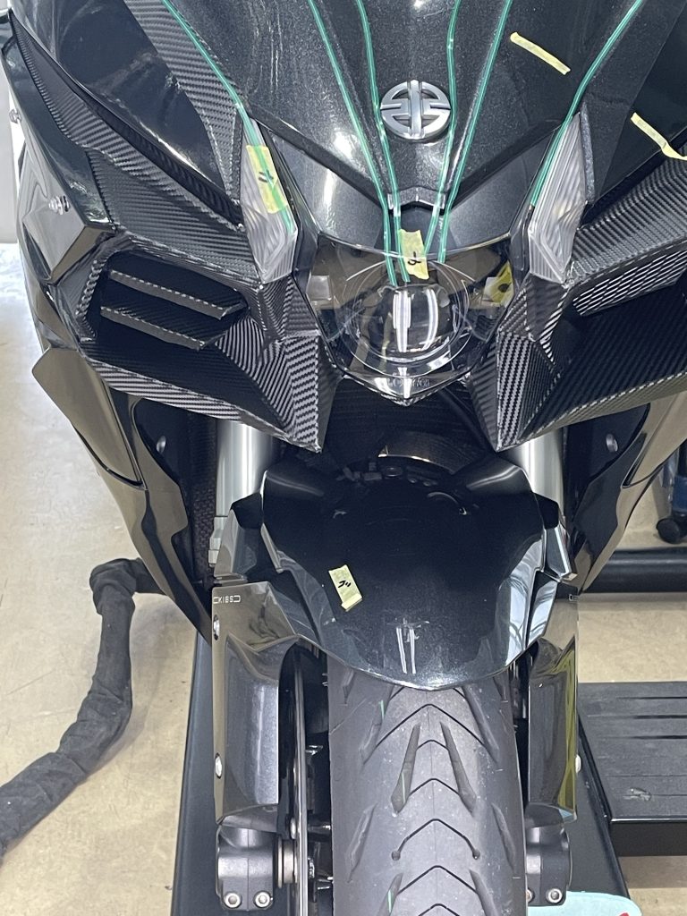 そう!!サイドカウルを邪魔してたのは、右端に写ってふ六角のもの。きっと転倒時にダメージを少なくするものかと?この奥のヘキサゴンボルトが全く回らない!レンチで舐めてしまいそうでした。 アンダーカウルとサイドカウルはカーボン。フィン2枚はグロスブラック。切り分け!切り替え!前輪の後ろ、Ninjaエンブレムが付いてたカウルはグロスブラック。これは一番大きなラッピングシートだったか、一枚で貼りました。