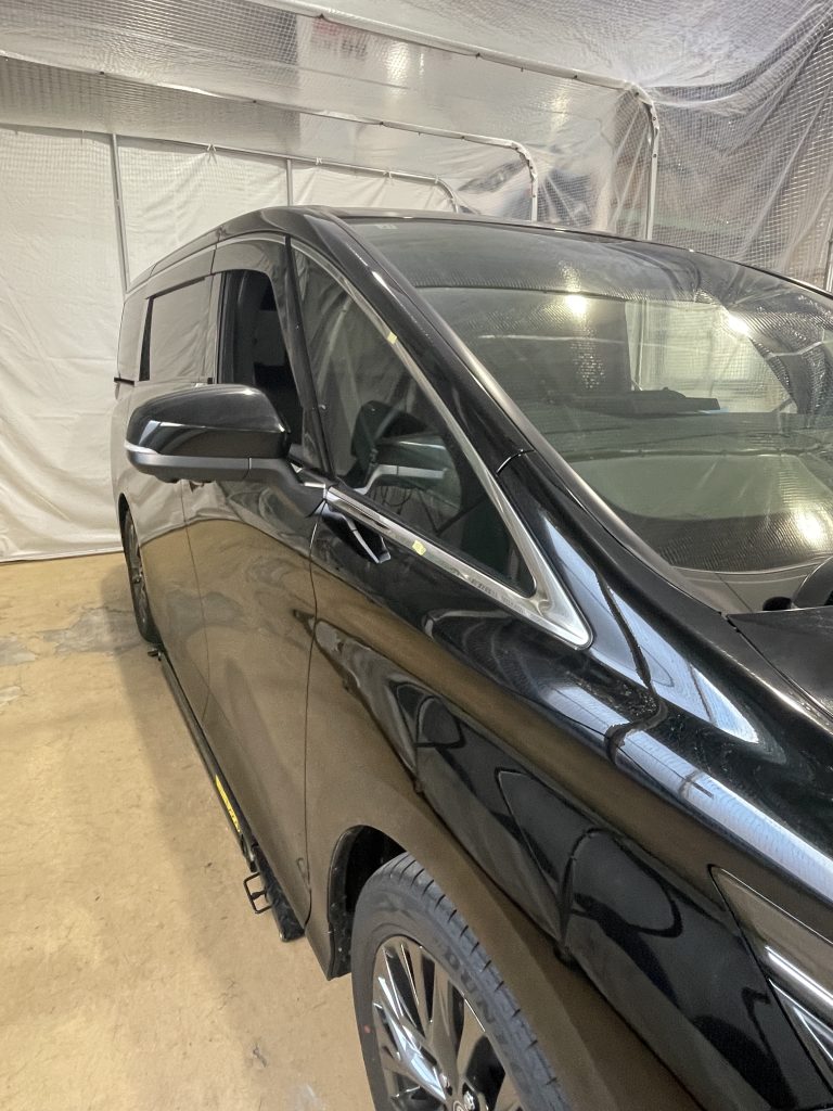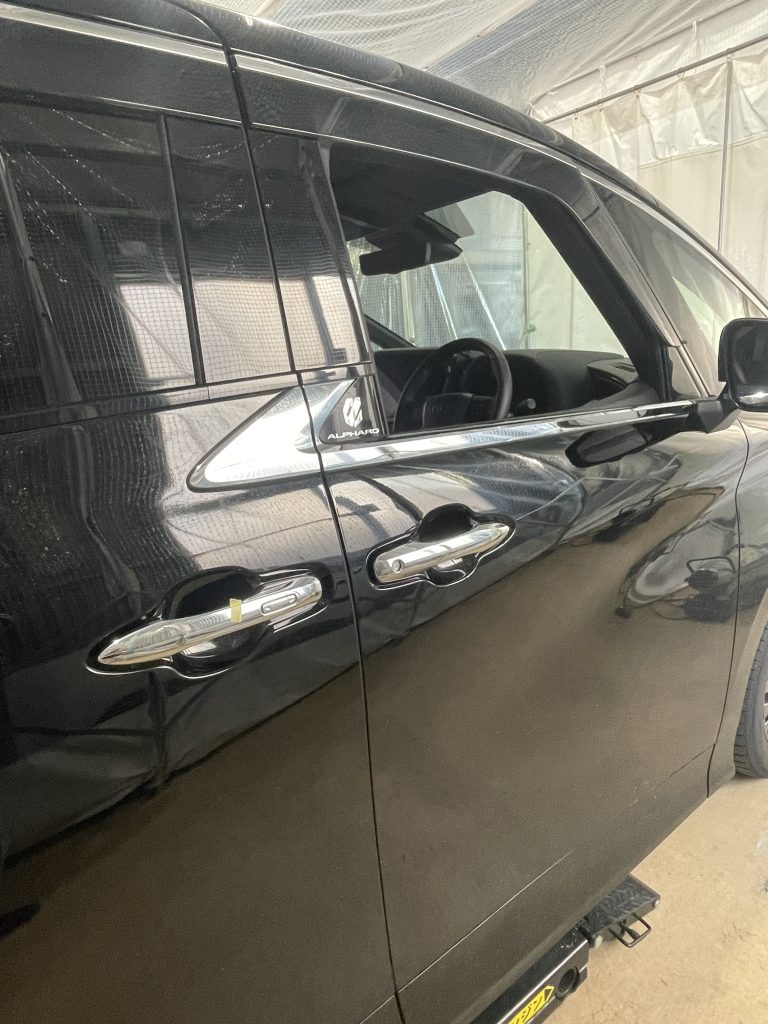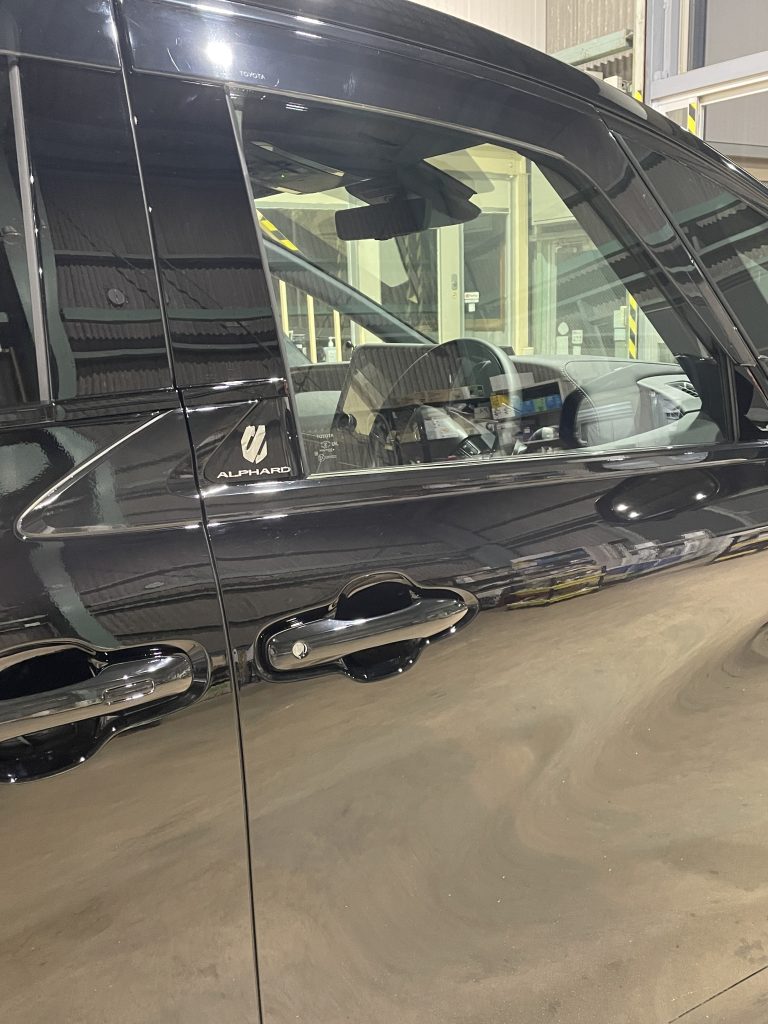 名古屋市港区のM様です。ひと月も経っていない黒色アルファードのメッキモールが浮いて見えるので、ラッピングでブラックアウトのご希望です。上の写真は全部施工前です。